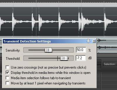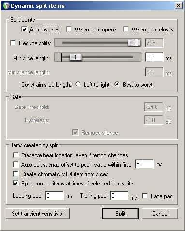 Let’s suppose you already have great samples that you want to use. In Reaper duplicate your kick and snare tracks and, starting with one copy of them, right click on the track and select Dynamic Split. In the dialog box select At transient, as you can see on the tracks there are some vertical dotted lines that identify where the split will be done. You can arrange the right splitting by clicking on Set transient sensitivity: now you can set the right threshold to let the program recognize each hit, you can see it from the lines on the wavesforms. If you notice too many split you can control them with the Reduce Split parameter.