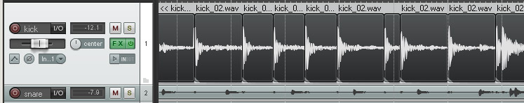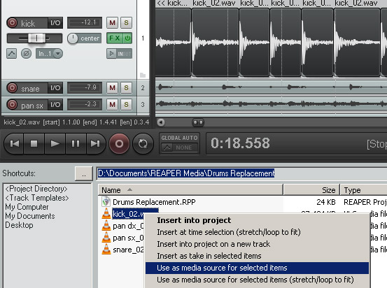 Now that you have your track with separate hits, open the Media explorer and navigate to your samples folder. Select the one that you like and right-click to select use as media source for selected items. The sample you selected will replace the hits. Make sure to uncheck the “loop source” proprerty on the items, to avoid unwanted repetitions. Now the “boring” part: you have to perform some checks throughout the entire track, first of all, identify possible phase problems. You have to “align” the two samples, the original and the replaced one, to have similar waveform, or you’ll have unwanted cancellation of the samples!